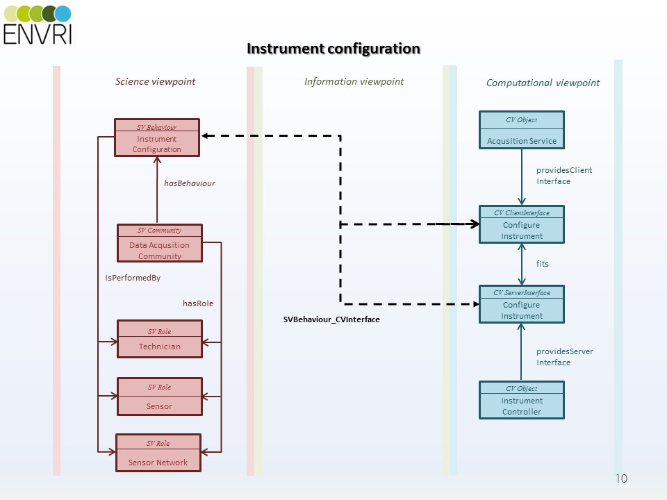Lastly, you have to consider correspondences between the different viewpoints. Correspondences are defined relations between entities in different viewpoints. So, for example: If a scientist (a role in the science viewpoint) configures an instrument (a behaviour in the science viewpoint), this corresponds to a specify measurement action (action type) that creates a specification of the measurement (information object) in the information viewpoint; which itself can correspond to a configure instrument interface on an instrument controller and a (data) acquisition service in the computational viewpoint. You can infer from that illustrative description that there is also a correspondence directly between the behaviour in the science viewpoint and the configure instrument interfaces in the computational viewpoint. You can see it illustrated below. There is a comprehensive tutorial video, Main Processes of the ENVRI Reference Model – Corresponding Viewpoints available to take you through these ideas in detail.