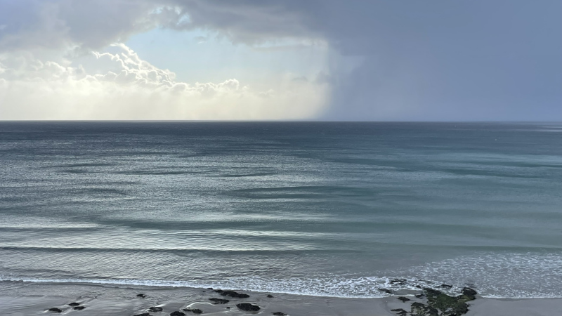 Beach extends towards the blue horizon, seas rippling, the foam of breaking waves. An occasional passing storm or ship breaks the sameness.